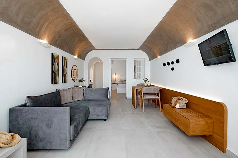 Fitted with a private balcony with unlimited caldera and Aegean Sea views, this large quadruple room is fitted with 2 separate bedrooms, each consisting of an private bathroom. It offers a mini-bar, 32" LCD satellite TV, free laptop and free Wi-Fi. An iron and electric kettle available in the room.
