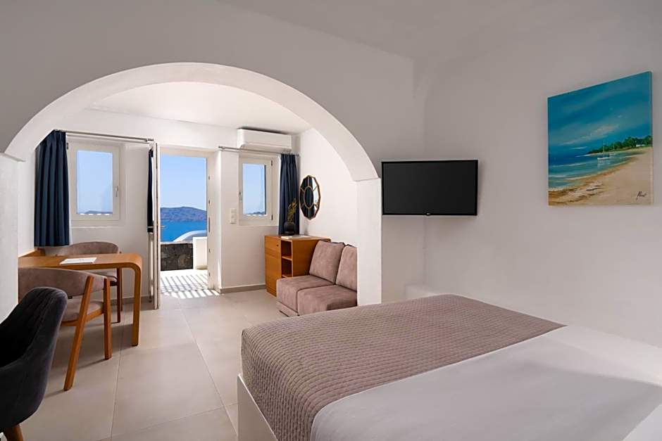 Fitted with a private balcony with unlimited caldera and Aegean Sea views, this spacious double room is decorated with earth tones and pale colors. It offers a mini-bar, 32" LCD satellite TV, free laptop and free Wi-Fi. An iron and electric kettle available in the room.